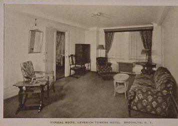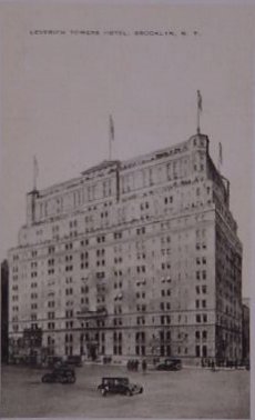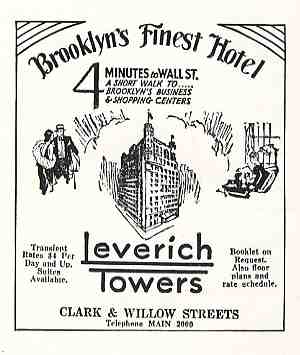 Leverich Towers Hotel A. Lyle Leverich, President of the Leverich Realty Corporation, of 143 Montague Street, which is a member of the Consolidated Exchange, is one of the youngest but immensely active realtors in Brooklyn, and probably the youngest president of a corporation listed on the exchange. He was born in 1898 in this boro, educated in private schools, and the Polytechnic Institute, from which he graduated in 1917. He then entered the realty field, which had been his family's line of endeavor for many years before. It was he, however, who founded the corporation, of which his father, Augustus A. Leverich is Vice President, and of which William A. Taylor is Secretary-Treasurer. Though young in years, Leverich possesses the discernment and the erudition of old age. But he preserves the enthusiasm and the capacity for effort incidental to young manhood, and it is the combination of the four that make him the wise businessman and the capable executive that he is. His latest project, the huge and magnificent hotel "Leverich Towers",, which is to be built in Brooklyn Heights, reflects the magnitude of his thought and the keeness of his vision, which is now amply justified by the ever-mounting values of real estate in the Heights. [Building up greater Brooklyn : with sketches of men instrumental in Brooklyn's amazing development. Wexelstein, Leon.. Brooklyn, N.Y.. Brooklyn Biographical Society. c1925, pp 132-133.]