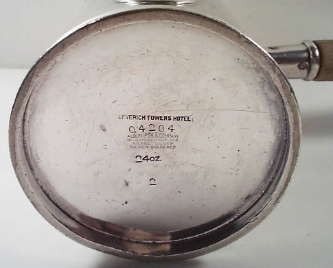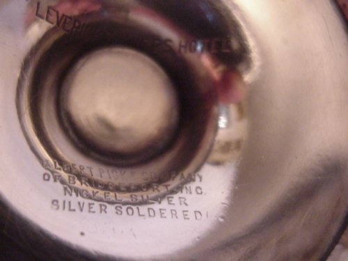 The following photos were graciously used with permission by ebay.com seller, Susan Ward Fernau. The description written was "This is a wonderful old piece of silverplate from the Leverich Towers Hotel that was located at Clark and Willow Streets in Brooklyn Heights, New York. Made by the Albert Pick Company of Bridgeport, circa 1910 - 1920. It is marked on the bottom with the hotel name and has a crest on it's side. Marked, also, on the base, Albert Pick & Company of Bridgeport, Inc. Nickle Silver, Silver Soldered.